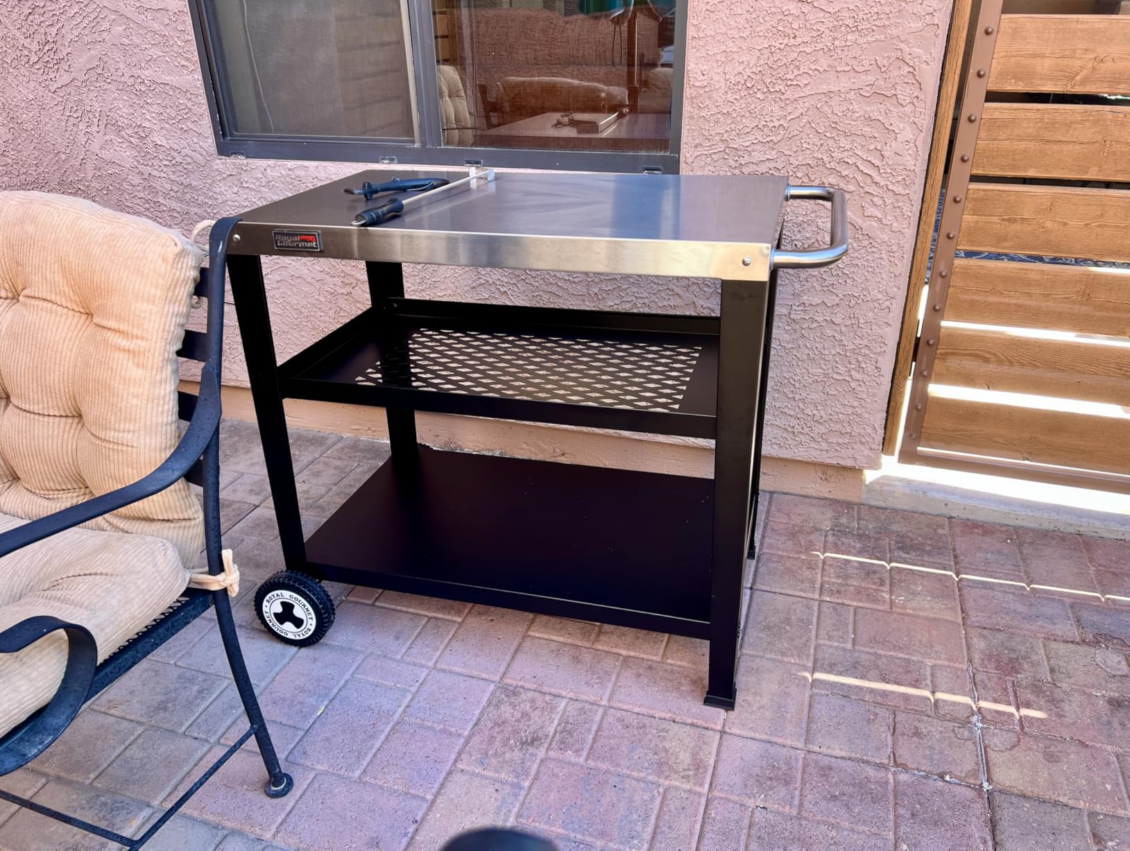 The two wheels on one end let me roll the cart from storage to cooking position, though the handle feels somewhat basic compared to premium carts. The waterproof black coating handled exposure to morning dew without any rust appearing on the metal frame after several weeks of outdoor use. S-hooks along the side hold tongs, spatulas, and a brush within easy reach.
