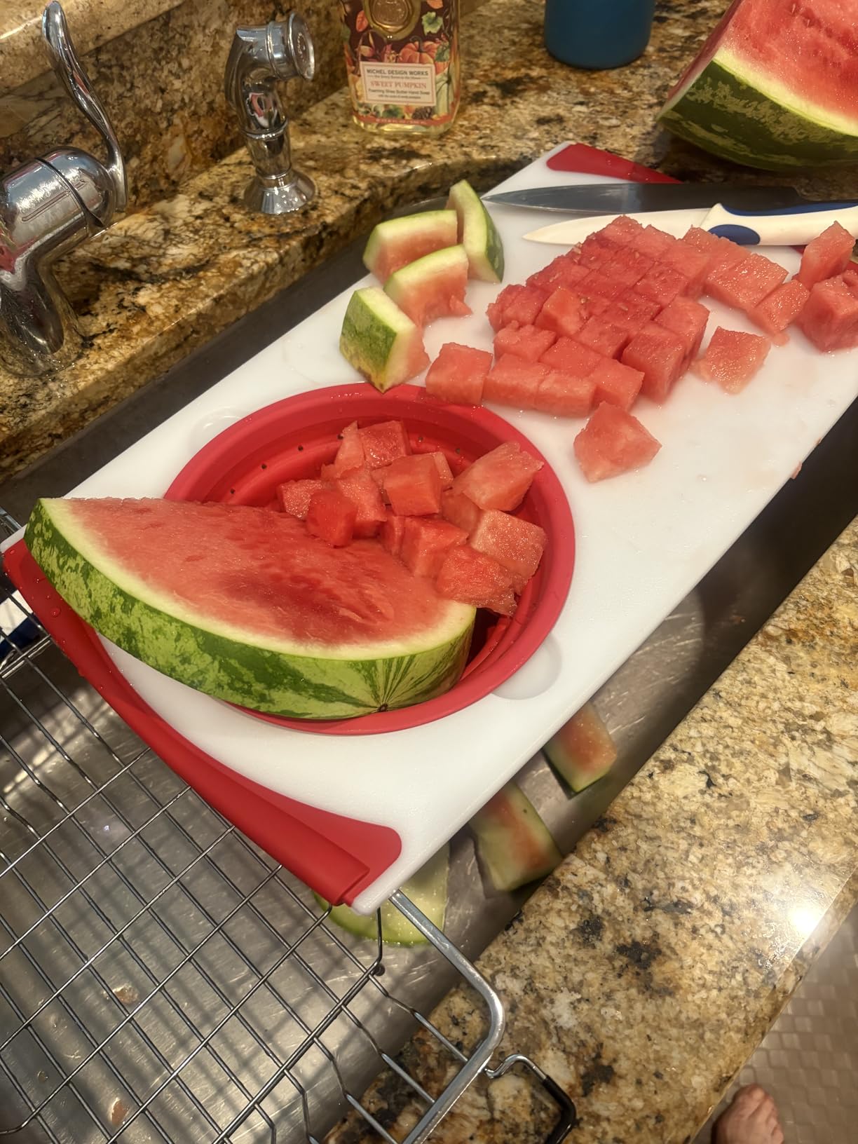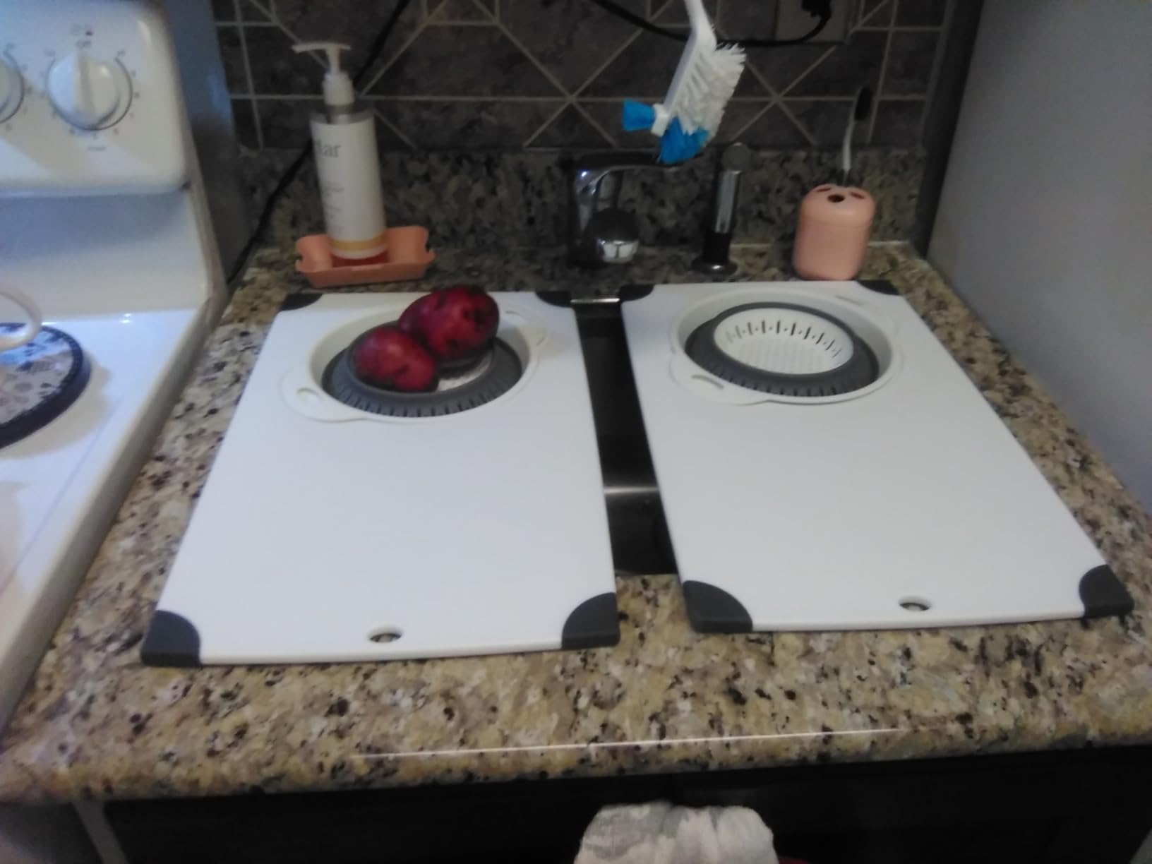 The non-slip rubber edges are genuinely effective. I chopped onions and carrots without the board shifting at all, even when placed on a slightly wet counter. The raised edges channel juices toward the center, keeping my workspace cleaner during juicy prep work. The collapsible 2.5 quart strainer works well and can be used independently as a colander for other kitchen tasks.