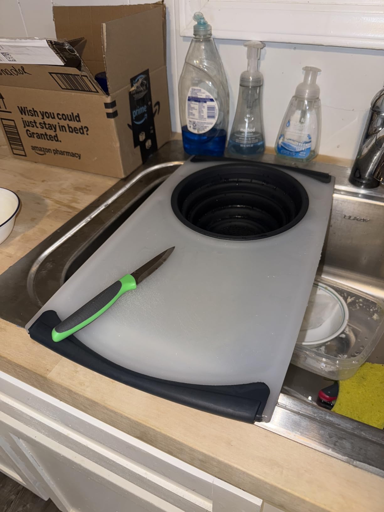 The collapsible colander is genuinely useful. I washed and chopped vegetables directly over the sink, then collapsed the basket and stored it flat in a drawer – no wasted space. The ergonomic handle on the drain basket makes it easy to remove even when wet. For RV owners, apartment dwellers, or anyone with a tiny kitchen, this combo design maximizes functionality in minimal space.