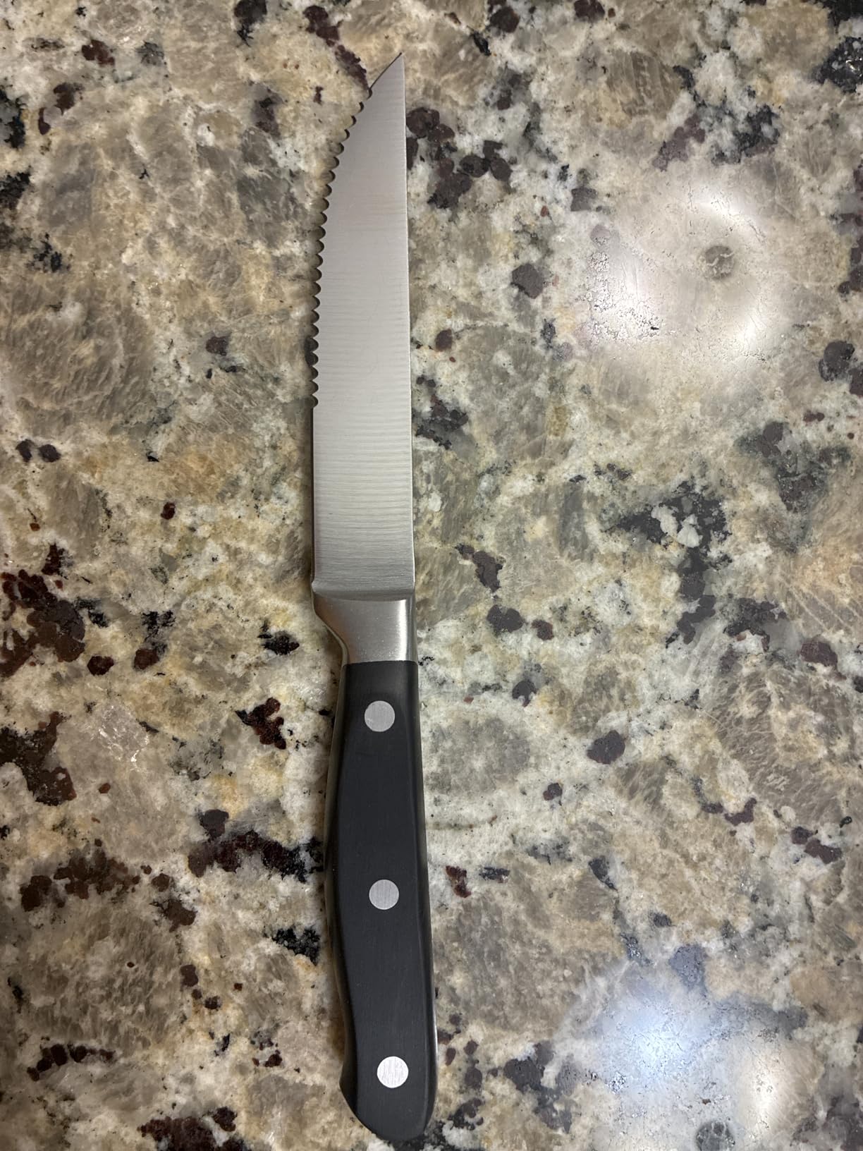 The black synthetic handles provide a contemporary look that complements modern table settings. Several dinner guests specifically commented on how stylish these knives look on the table, making them a great choice for anyone updating their dining aesthetic. The triple-riveted construction ensures durability, though some users have reported occasional rivet issues over extended use.